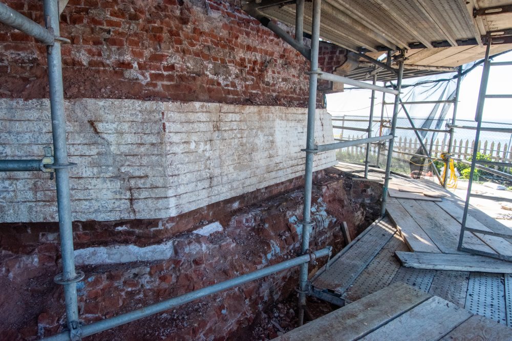 The photo array follows the lowest belt course from the start of the project in January 2024 to December 2025 with the attachment of the new steel framing to the brick at the tower’s base. A piece of the final “skin” waits on the ground for mounting and welding. Once the installation is complete, the new belt course will be coated black to recreate the look and feel of the original belt course.