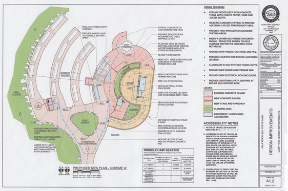 The majority of the seating will remain, but the first and third rows will be reconfigured to provide wheelchair space. Much of the existing electrical conduit will be reused along with the benches, path lighting and planting areas.