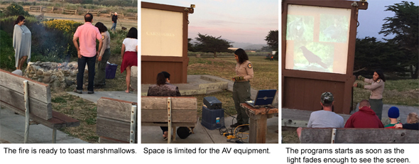 The program on the evening I visited, “Carnivores, Herbivores and Omnivores,” was presented by Interpreter Naturalist Angie Lozano. She started the fire early so that it would be hot enough to toast the marshmallows when people started to arrive. The presentation began as soon as the twilight diminished enough to see the screen. As you can see in the center picture below, setup for the projector isn’t optimal.