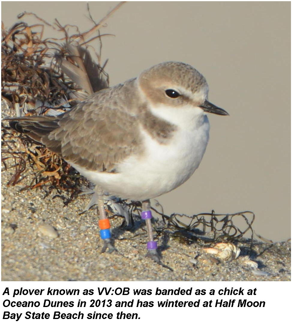 Some individual plovers can be identified and their movements tracked because unique combinations of colored bands have been attached on their legs. (The colored bands are “read” top-to-bottom starting with the left leg. The colors are coded mostly by the colors’ initials; thus, the snowy plover shown in the photo with bands of violet/violet and orange/blue is denoted as VV:OB.) This year plovers were observed on the winter survey on the San Mateo Coast that originally hatched as far away as Oceano Dunes in San Luis Obispo County (238 miles away) and Oregon (over 400 miles away).