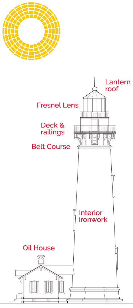 The Fresnel lens, with its 1,008 delicate glass elements, was removed from the tower in 2011 and is now on display in the Fog Signal Building. Once rehabilitation is complete, it will return to the top of the tower.