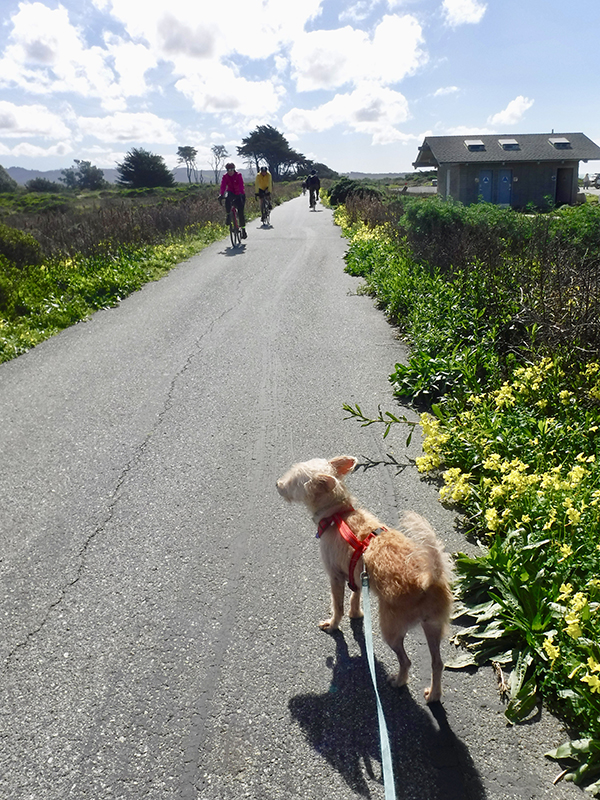 Since it is spring, there is often a stiff wind coming from the north. We recommend starting at Francis State Beach (parking is $10) and follow the paved trail north past Venice Beach (the site of Coastal Wildflower Day), Dunes Beach, and Roosevelt Beach. If you are with your dog, you’ll find many trailside benches to take a rest and take in the view. A favorite is the bench right near the Sweetwood group camp site.